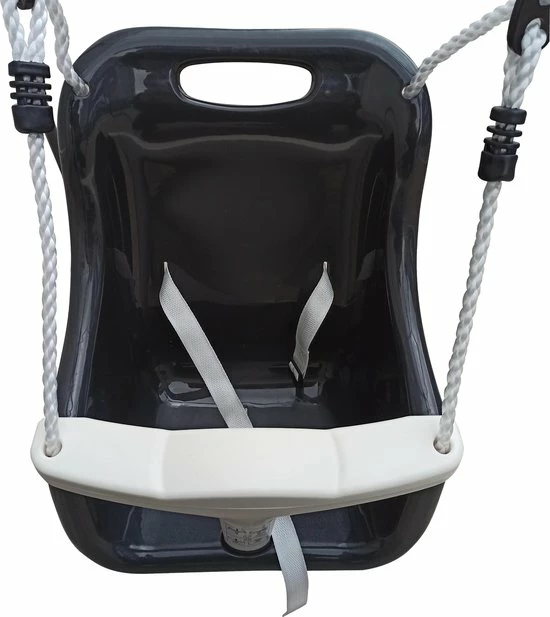 De baby schommel set bevat een babyschommelzitje met een hoge rug voor extra comfort. T-bar met 3 steunpunten en een extra veiligheidsriem voor maximale veiligheid. De ringen en stelachten zijn vervaardigd in gegalvaniseerd staal met een HDPE kunststof buitenzijde. De lassen op de touwen zijn van HDPE kunststof. Het zitje is geschikt voor kinderen van 9 tot en met 36 maanden oud.