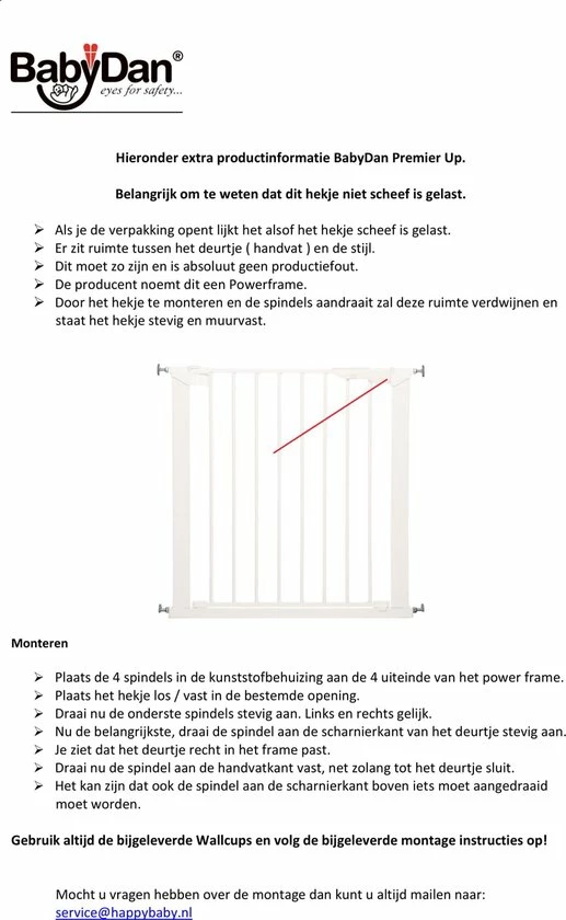 Het aanschaffen van een voor u passend traphekje, deurhekje of welke veiligheidsafscheiding dan ook is een belangrijke overweging. We vinden het belangrijk u goed te adviseren en staan hier altijd voor klaar. Neem gerust contact met ons op. Happy Baby Nederland: Offici?le importeur BabyDan Energieweg 8b 4321DJ Meerkerk 0183-352111 [email protected] We helpen u graag verder. Lees de gebruiksaanwijzing zorgvuldig door en bewaar deze voor toekomstig gebruik. Extra uitbreidingen zijn apart verkrijgbaar, uitbreidingen worden bij sommige modellen meegeleverd.