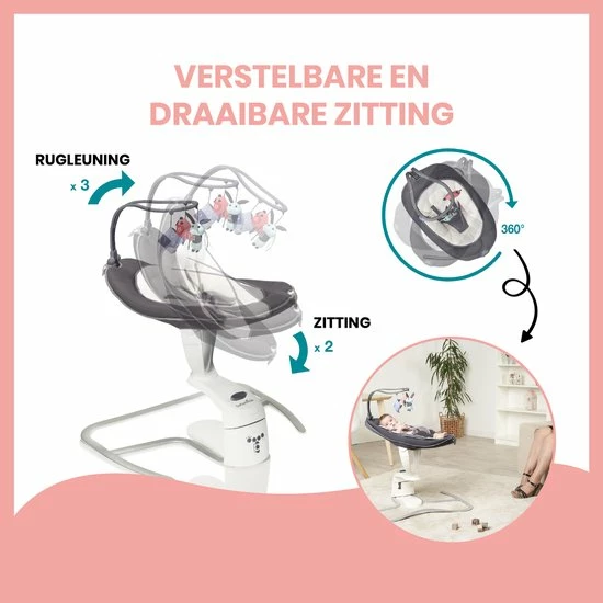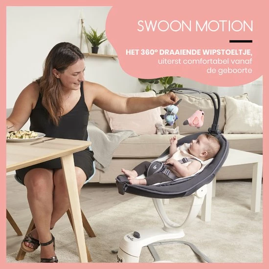 Met zijn 360? draaibare zitting ontdekt uw baby zijn omgeving, deelt hij de gezellige gezinsmomenten en is hij altijd bij u in de buurt. Dankzij de 2 manieren om te wiegen (zijwaarts of van voren naar achteren) en zijn 5 snelheden wiegt het wipstoeltje uw baby op dezelfde zachte wijze als in uw armen. Met zijn zachte materialen en verkleinkussen voor pasgeborenen is de Swoon Motion een heerlijk zacht nestje voor uw kindje. Hij is altijd ideaal naar wens ge?nstalleerd dankzij de in 5 standen verstelbare zitting (3 ter hoogte van de rugleuning en 2 ter hoogte van de voetjes).