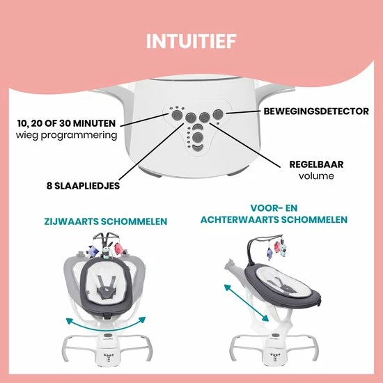 De wiegtijd van het Swoon Motion wipstoeltje kan geprogrammeerd worden op 10, 20 of 30 minuten. Met de functie bewegingsdetector kan het wiegen automatisch ingeschakeld worden wanneer uw baby onrustig begint te worden.