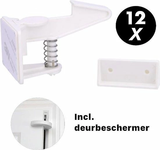 Naast 12 kindersloten wordt uw bestelling geleverd met een deurbeschermer die bedoelt is om te voorkomen dat uw kinds vinger tussen de deur komen.