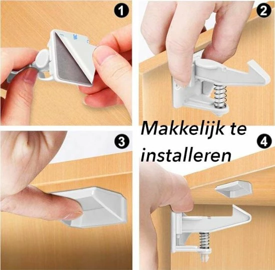 De kindersloten zijn eenvoudig te monteren door de supersterke zelfklevende 3M tape aan beide onderdelen van het kastslot. U hoeft dus geen gaten te boren in uw kastjes, die achteraf een lelijk gat achterlaten. Maak het oppervlak wel vet- en stofvrij voordat u de stickerzijdes aanbrengt.