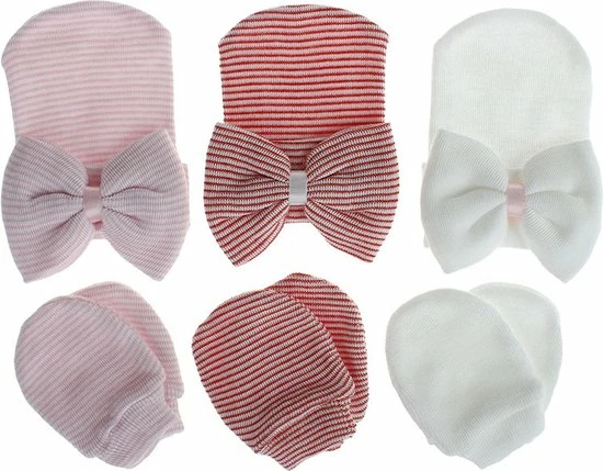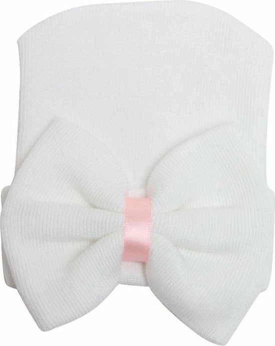 Een prachtige en schattige newborn babymutje in het wit met een strikje van ongeveer 10cm met handschoenentjes.