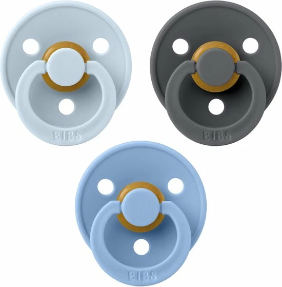 Deze set van 3 BIBS fopspenen bevat de kleuren: Skyblue, Iron en Baby Blue! BIBS fopspenen bestaan uit 100% natuurlijk rubber, zijn flexibel en voelen fluweelzacht aan. De BIBS speen is ontwikkeld om de zuigreflex van het kindje te ondersteunen. Het schildje van de speen is rond en buigt weg van het gezichtje, waardoor eventuele irritaties worden verminderd. De BIBS fopspeentjes komen in ?norm veel kleuren voor en hier blijven talloze prachtige creaties bijkomen. Naast het unieke design van de speen, heeft de BIBS speen ook hoogwaardige kwaliteiten ?n voelt deze comfortabel aan.