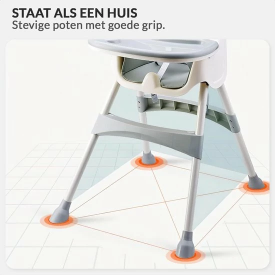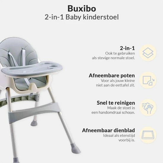 Met de Buxibo een babyzitje/kinderstoel in één kan je heel vroeg al beginnen om met je baby aan tafel te zitten. Door de meervoudige hoogteverstelling zit je kindje altijd op ooghoogte. De lichtgewicht kinderstoel is compact en neemt dus niet veel ruimte in beslag. Heb je even geen ruimte voor de kinderstoel, dan kan je het zitje loskoppelen en los op een stoel plaatsen.