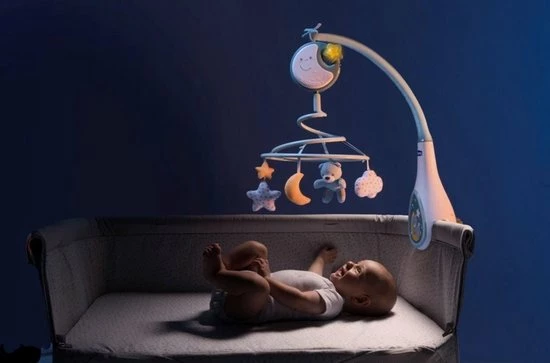 Deze schattige mobiel bevat pluche figuurtjes die zachtjes ronddraaien boven het bedje van je kleintje. Daarnaast speelt de muziekmobiel 20 minuten aan klassieke melodieën van Chopin, Schumann en Offenbach af. Ook kun je er voor kiezen om witte ruis te laten horen, een vertrouwd geluid dat baby’s ook tijdens de zwangerschap horen.