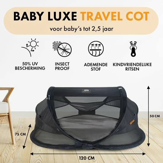 De DERYAN Baby Luxe is d? ideale oplossing ?n vervanging van het zware campingbedje. Laat je niets meer in de weg staan met deze compacte, lichtgewicht & pop-up reistent. De DERYAN Baby Luxe biedt een ultieme bescherming tegen zon, muggen en andere insecten. Met zijn 1,8 kg neem je ?m in een handomdraai mee naar ouders, familie, vrienden, vakantie of de wereldreis van je dromen! Ondenkbaar veel mogelijkheden!