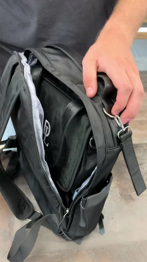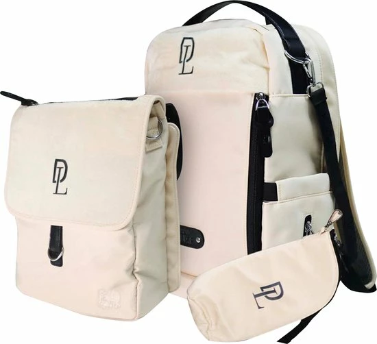 De stoere en stijlvolle tas van DERYAN bestaat uit drie delen. De grote rugtas is voorzien van verschillende opbergvakjes en is standaard uitgerust met een handig verschoonmatje. De tweede tas is door middel van ritsen bevestigd aan de voorkant van de rugtas en is te gebruiken als handtas. De voorzijde is gemaakt van zachte velours stof, wat deze tas een stijlvolle look geeft.