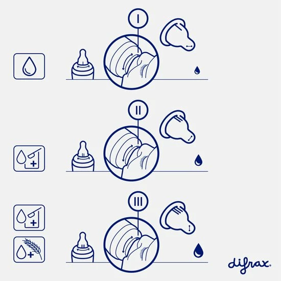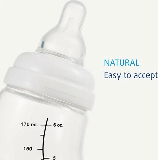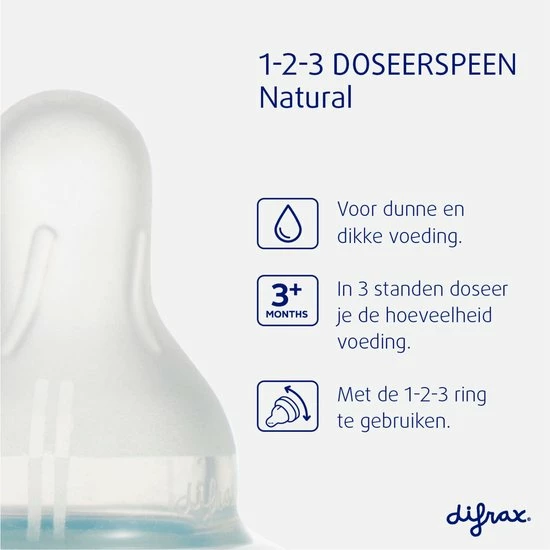 De 1-2-3 Doseerfles is geschikt voor dunne en dikke voeding en te gebruiken vanaf 3 maanden. Ideaal wanneer je kindje melkvoeding krijgt maar ook dikke voeding zoals rijstebloem of fijne granen pap. De speciale coating op de speen zorgt voor extra grip. De flessenspeen heeft een zachte ronde tepelvorm welke lijkt op de moederborst.
