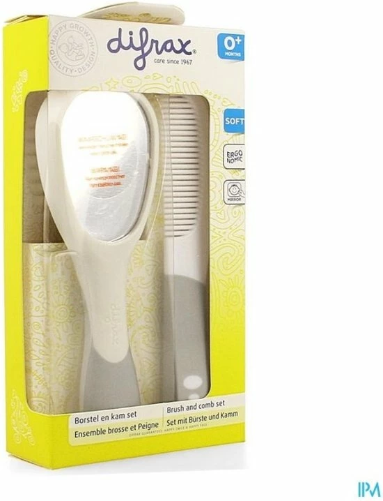 Difrax borstel en kam set is speciaal ontworpen voor baby’s gevoelige hoofdhuid. De kam heeft speciale nopjes op de tanden ter bescherming van de hoofdhuid en oren. Door de vorm ligt het handvat fijn in de hand. De borstel en kam hebben een trendy design en zijn verkrijgbaar in vrolijke kleurtjes.