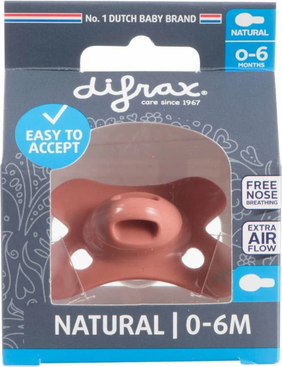 Difrax fopspeen baby’s van 0-6 maanden in naturel brick De Difrax Fopspeen 0-6 maanden Natural voldoet aan de zuigbehoefte van je baby. Deze fopspeen is symmetrisch, wat je baby snel herkent en makkelijk(er) zal accepteren. De grootte van het fopspeen schildje en die van het zuiggedeelte zijn speciaal ontwikkeld voor pasgeboren baby?s tot 6 maanden.