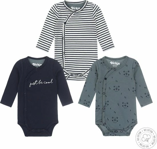3 leuke Dirkje rompertjes voor meisjes. Het eerste rompertje is navy van kleur en bevat de tekst ”Just be cool” in het off-white. Het tweede rompertje is off-white gekleurd en is voorzien van een navy gestreepte all over print. Het derde rompertje is dusty green met een all over print van navy beren.
