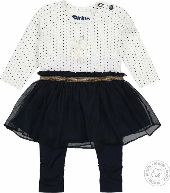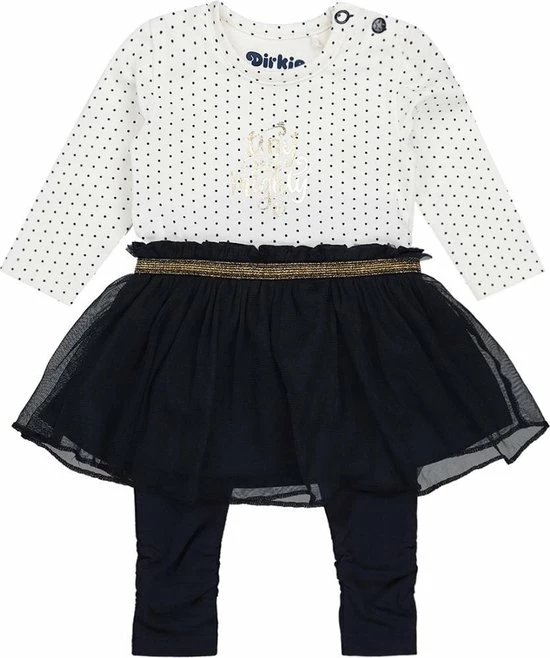 Schattig 2-delig Dirkje babysetje voor meisjes. De top van het jurkje is off-white gekleurd en bevat een navy gestipte all over print. Het rokje is navy gekleurd en is voorzien van een gouden elastiek om de middel. Ook bevat dit setje een navy legging.