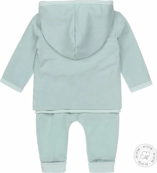 3-delig Dirkje unisex babysetje. Dit setje dat zowel door jongens als door meisjes gedragen kan worden bevat een cloud blue vest en broek. De broek heeft een omslagboord met een off-white met cloud blue gestreepte binnenkant. Het shirt bevat dezelfde horizontale strepen in dezelfde kleuren.