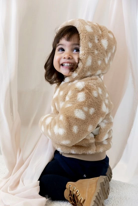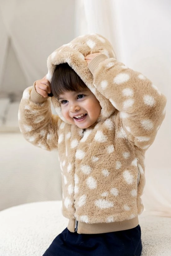 Dirkje meisjes jack met een hoog knuffelgehalte! Het jasje in een beige kleur heeft witte stippen en is gemaakt van een heerlijk zachte nep bont. De jas heeft een capuchon en sluit met een rits. Ideaal als tussenjas of bij frissere dagen.