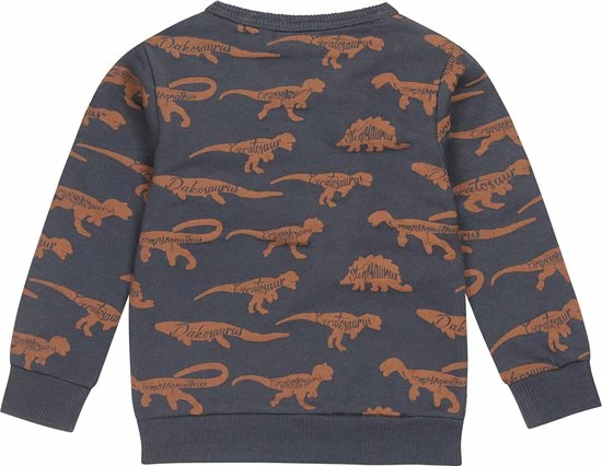 Een stoere sweater voor je stoere mannetje! De donkerblauwe Dirkje jongens trui heeft een all-over dino print in een bruine kleur. De sweater heeft een ribboord aan de hals, mouwen en onderaan de trui en heeft als leuk detail een mooie bies over de arm. De maatjes tot en met 86 sluiten met drukkers op de schouder.
