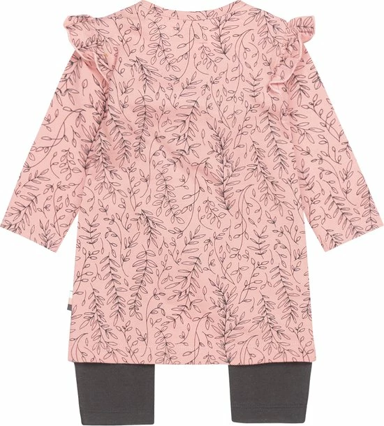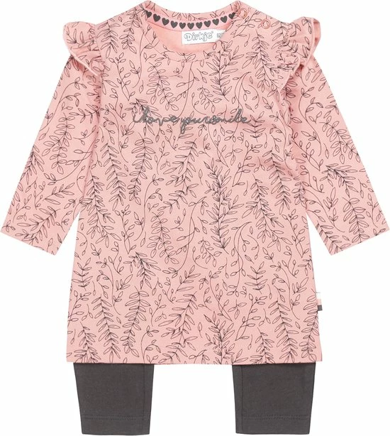 Van dit Dirkje jurkje wordt je toch helemaal blij?! De roze jurk heeft lange mouwen en is voorzien van een mooie all-over leaves print en tekst op de borst. De ruffles op de schouder maken het jurkje extra cute! De set heeft een bijpassende legging in de kleur donkergrijs.