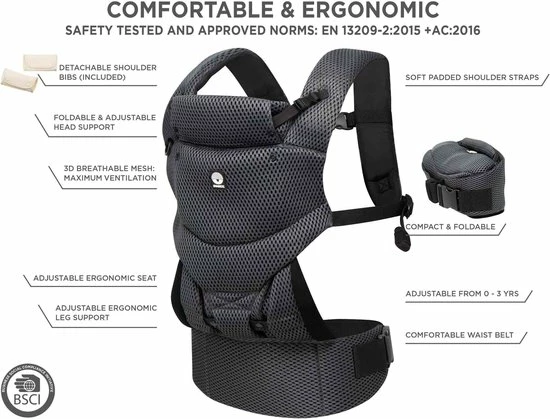 De Dooky draagzak ziet er niet alleen trendy uit, je baby zit er ook op de juiste, ergonomische M-positie in, met de knietjes hoger dan de billetjes. Zowel de zitting als de beensteuntjes zijn verstelbaar. Hij is gemaakt van 3D ademend meshstof voor een uitstekende ventilatie.