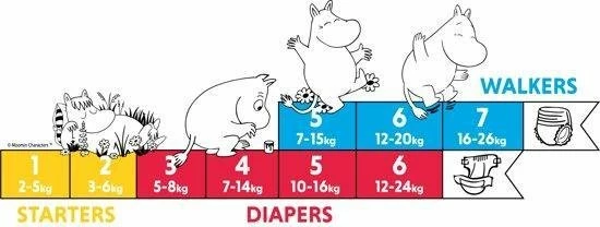Kies de juiste maat aan de hand van het gewicht van uw kindje (zie onderstaand overzicht). De Muumi Baby luiers worden gemaakt van volledig chloorvrije pulp, afkomstig uit duurzaam beheerde bossen. Ze zijn gecertificeerd met het Nordic Swan Ecolabel. Ze zijn ontwikkeld in samenwerking met de Finse “Allergy and Asthma Federation” en zijn dermatologisch getest. De Muumi Baby luiers bevatten geen parfum, lotion, latex, formaldehyde of ftalaten!