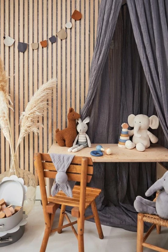 De klamboe is helemaal babykamerproof. Zodra die hangt is de babykamer in de juiste sferen.