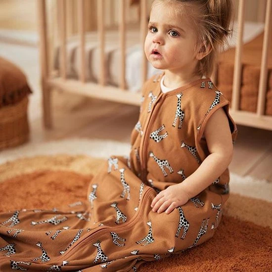 Deze slaapzak is verkrijgbaar in jeansblauw en caramel. Beiden uitgevoerd met een print van zwart witte giraffes.