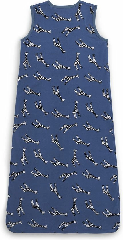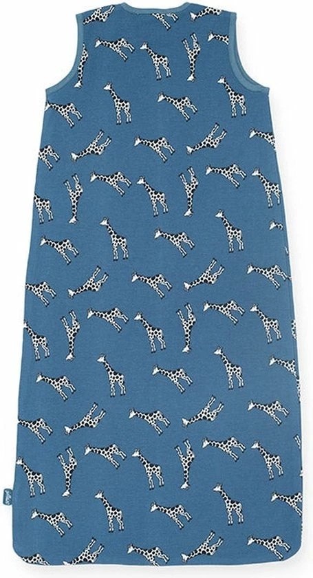 Deze slaapzak is verkrijgbaar in jeansblauw en caramel. Beiden uitgevoerd met een print van zwart witte giraffes.