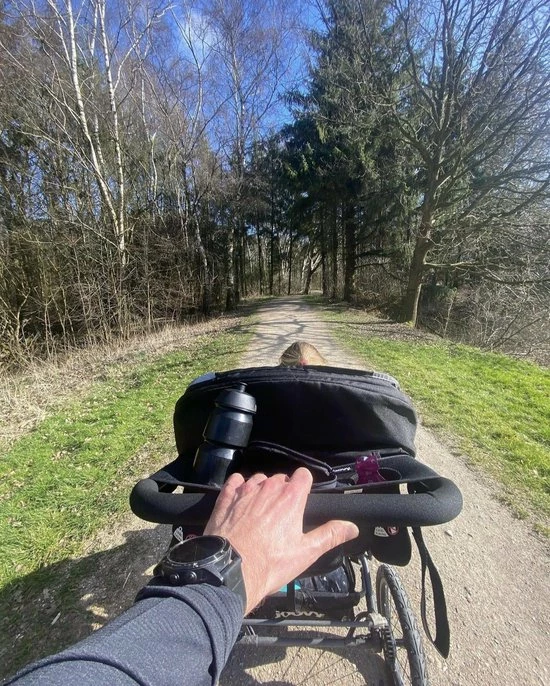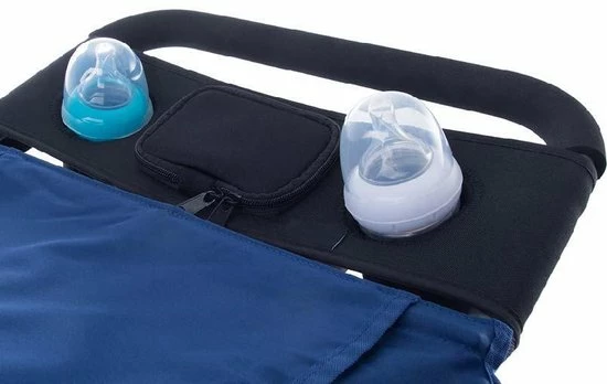 De organizer is superhandig voor onderweg, uitgerust met drankhouders en een ritsvak voor je sleutels en telefoon. Een bandenpomp is ook inbegrepen, zodat je banden overal op de juiste spanning staan.