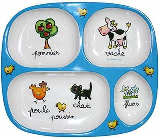 Dit bordje is diep, zodat het geschikt is voor warm eten, maar door de vorm is het ook zeer geschikt voor bijvoorbeeld stukjes brood. Deze rollen er niet zo gemakkelijk uit. Ook kun je de porties in de verschillende vakjes verdelen, wat het leegeten van het bord aantrekkelijker maakt.