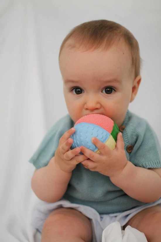 Proeven: het speelgoed is veilig om op te kauwen en sabbelen en eenvoudig vast te pakken.
