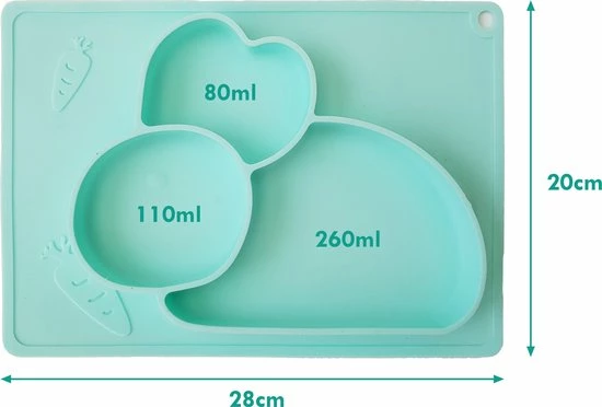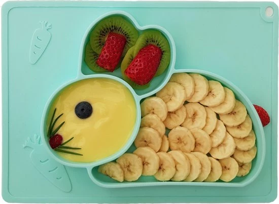 De Placemat is gemaakt van 100% siliconen in de vorm van een Konijn. U kunt in elke ruimte ander eten doen en hij is Magnetron en Vaatwasbestendig.