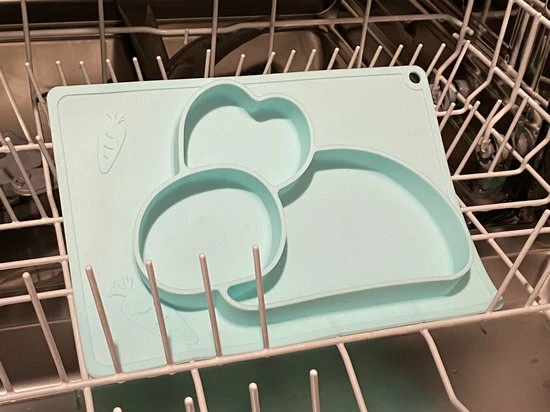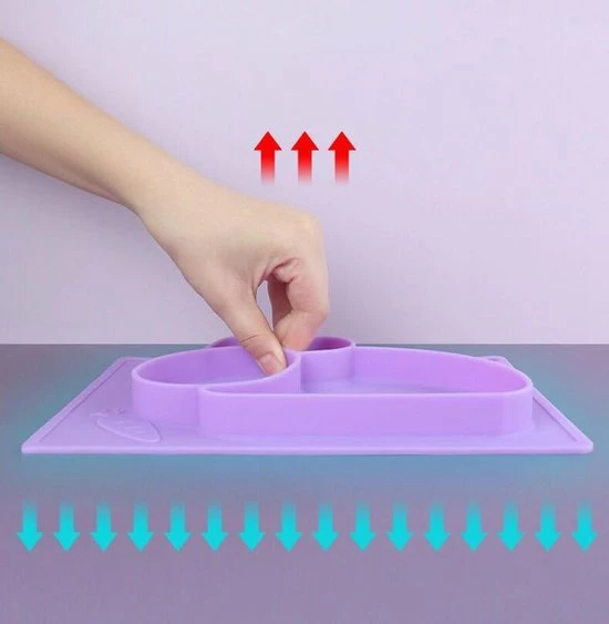De onderkant is vlak en hecht zich gemakkelijk aan een eettafel of plaat van een kinderzitje, zodat uw baby het bordje niet gemakkelijk van de tafel kan trekken of gooien. Let er wel op dat het oppervlak waarop u de placemat legt egaal en schoon is voor een goede hechting. U kunt zo nodig een paar druppels water onder de Placemat sprenkelen voor een betere hechting.