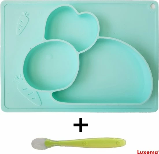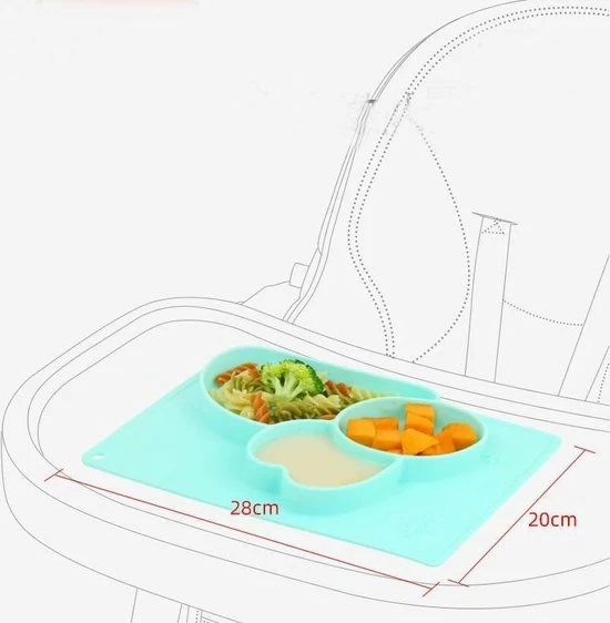 Met deze handige Placemat en Bord in 1 wordt eten één groot feest ! Ook zit er een gratis Lepel bij, gemaakt van zacht siliconen zodat u baby zich geen pijn kan doen aan het gehemelte.
