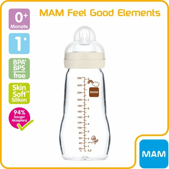 MAM Feel Good glazen fles, 260 ml Fles met wijde hals van hoogwaardig glas, bijzonder hitte- en temperatuurbestendig, hygiënisch en duurzaam.