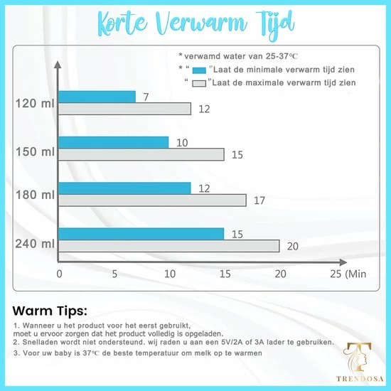 - Meerdere temperaturen mogelijk, Om precies te zijn maar liefst 3 temperaturen met een simpele klik op de onderkant van het product! Zo is de melk of het warme drankje in de fles altijd de gewenste temperatuur! 37, 40 en 45 Graden.