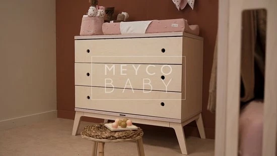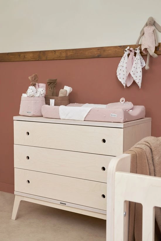 De commodemand is verkrijgbaar in diverse kleuren en in een small en medium variant met de afmetingen: small 21x16xh16 cm en medium 26x19xh16 cm. De binnenkant kun je afnemen met een vochtig doekje. Dus mocht er een flesje of potje lekken dan is er niets aan de hand en maak je het zo weer schoon. Mix en match het mandje met de rest van de Meyco Baby collectie en creëer een complete look in de babyslaapkamer.