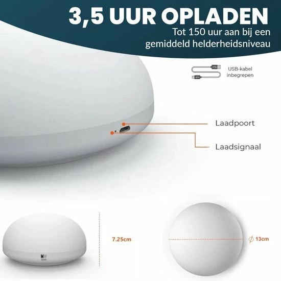 ‘Ik moet na 1 nacht de lamp zeker weer opladen of niet?’. Nee natuurlijk niet! Onze unieke nachtlamp kan tot wel 150 uur meegaan op een volle batterij en gedimde stand. Zo kan jij lekker lang genieten van deze nachtlamp!