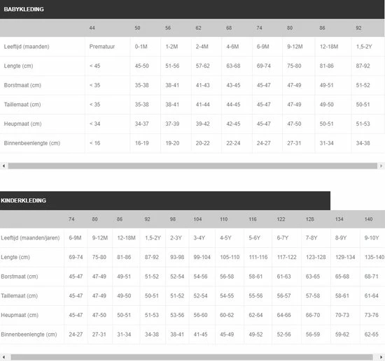 | Maat | 44, 50, 56, 62, 68, 74 |