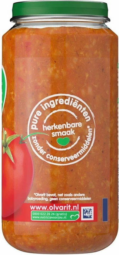 6-pack Olvarit Tomaat Kip Rijst, geschikt voor baby?s vanaf 1 jaar oud. Een babyhapje met een herkenbare smaak & textuur dat bijdraagt aan de smaakontwikkeling.