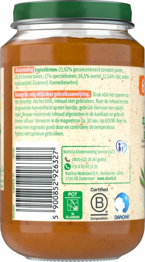 6-pack Olvarit Maaltijdhapjes Vegetarische Bruine Bonenschotel geschikt voor baby?s van 6 tot 8 maanden oud. Een babyhapje met een herkenbare smaak & textuur dat bijdraagt aan de smaakontwikkeling.