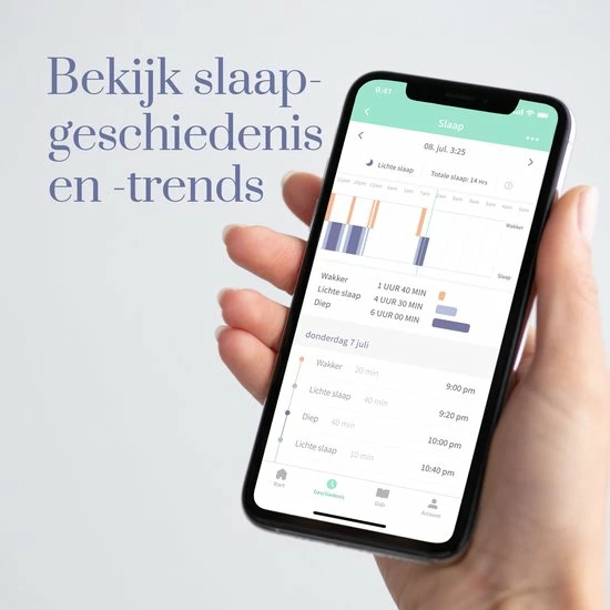 - Meet slaapritmes: bekijk het totaal aantal uur slaap, aantal keer wakker worden, slaapkwaliteit en meer.