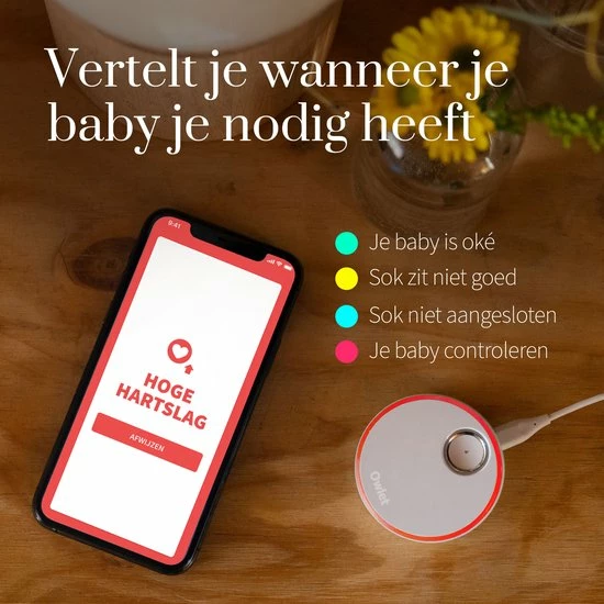 - Vertelt je wanneer je baby je nodig heeft: Basisstation en Owlet-app geven meldingen wanneer meetwaarden buiten de ‘veilige’ zones komen.