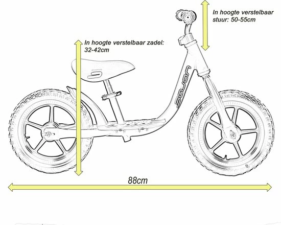 Deze loopfiets is voorzien van een paar wielen van 12 inch. Ook wanneer je zoon of dochter iets ouder is, is het een handig fietsje om te gebruiken. Je kunt zowel het zadel als het stuur verstellen. Dit maakt het voor iedere ouder mogelijk om de juiste hoogte in te stellen. Het zadel is te verstellen tussen de 32 en 42 cm. Het stuur kan versteld worden tussen de 50 en 55 cm. Door vandaag nog te kiezen voor deze handige loopfiets weet je zeker dat je een prima aankoop in handen hebt.