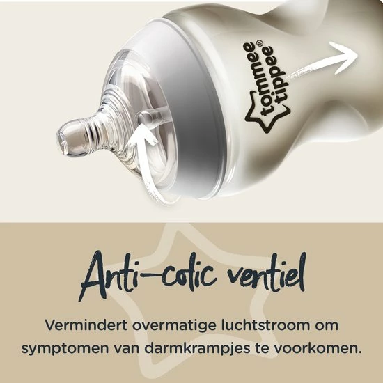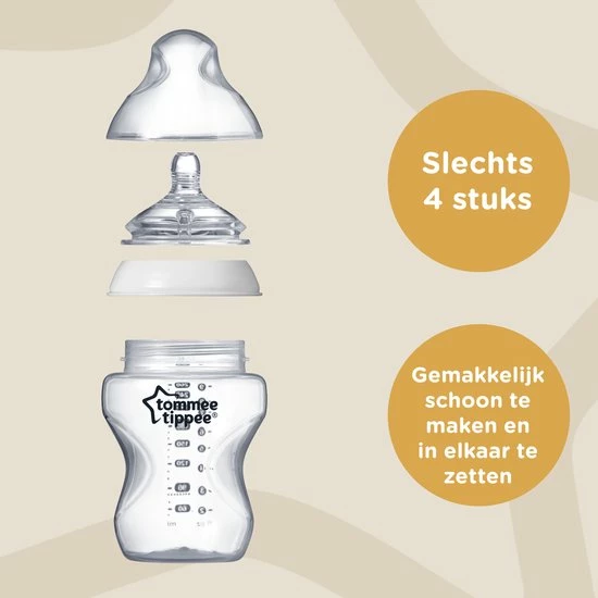 Met onze bekroonde** Closer to Nature-zuigfles is de overschakeling van borst- naar flesvoeding nog nooit zo eenvoudig geweest ? het is namelijk verkozen tot moeders zuigfles nummer ??n voor de overschakeling van borst- naar flesvoeding!* Met onze tepelspeen en ingebouwde anti-koliekventiel is dit misschien wel het beste voor de baby, na u! Ge?nspireerd door moeders, ontworpen door experts. Onze gemakkelijk aan te leggen tepelspeen, geliefd bij moeders en baby’s, voelt dichter op de huid en bootst de natuurlijke vorm en beweging van de moederborst na voor een comfortabele voeding. 95% van de moeders heeft gemeld dat de superzachte, als de huid aanvoelende siliconen speen door hun baby werd geaccepteerd en ze deze aan anderen zou aanbevelen. * Alle Closer to Nature-flesspenen zijn voorzien van een anti-kolieksysteem om darmkrampjes te voorkomen door ervoor te zorgen dat uw kind meer melk en minder lucht binnenkrijgt. Samen met het gevoelige ventiel van de zuigfles stimuleert de brede flessenhals de intu?tieve voeding van uw baby. De compacte vorm van de zuigfles, die is ontworpen om tijdens het voeden in de meest natuurlijke positie te worden gehouden, zorgt er ook voor dat de baby dichter bij u kan zijn. Tommee Tippee Closer to Nature-zuigflessen zijn verkrijgbaar in een breed scala aan maten, kleuren en versieringen. De spenen zijn ook verkrijgbaar met verschillende uitstroomsnelheden, zodat de melk sneller kan stromen naarmate uw baby meer honger krijgt! Dankzij de wijde flessenhals zijn de zuigflessen eenvoudig schoon te maken en zijn ze geschikt voor gebruik in de vaatwasser, magnetron en stoomsterilisatoren. 100% BPA-vrij voor volledige gemoedsrust. Welke uitstroomsnelheid heb ik nodig? We bieden verschillende uitstroomsnelheden om met uw baby mee te groeien. Elke baby is anders, maar als richtlijn raden we een langzame stroom aan voor 0+ maanden, een gemiddelde stroom voor 3+ maanden en een snelle stroom voor 6+ maanden. Closer to Nature-spenen zijn alleen compatibel met Closer to Nature-zuigflessen. Hoe vaak moet ik de flesspenen vervangen? We raden aan om uw flesspenen om de twee maanden te vervangen en ze moeten onmiddellijk worden vervangen als ze beschadigd of slap zijn. * Gebaseerd op een onderzoek uit 2021 onder 524 ouders die Tommee Tippee zuigflessen gebruiken ** Made for Mums, maart 2020
