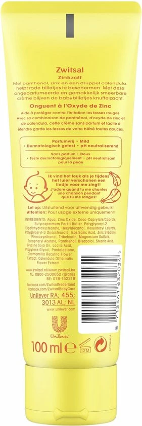 De zalf legt een beschermend laagje aan tussen de luier en de billen. Zo verklein je dus de kans dat de irriterende stoffen in de ontlasting in aanraking komen met de billetjes. Doordat Zwitsal Zinkzalf Baby in een handige en compacte tube wordt geleverd, is het product overal mee naartoe te nemen. Stop het in je verzorgingstas zodat je de billetjes van je kleintje op ieder moment en op iedere plek van de beste verzorging kunt voorzien. Naast het feit dat de zinkzalf de beste verzorging biedt voor billetjes, bevat het de heerlijke en vertrouwde geur van Zwitsal zoals je die gewend bent.